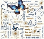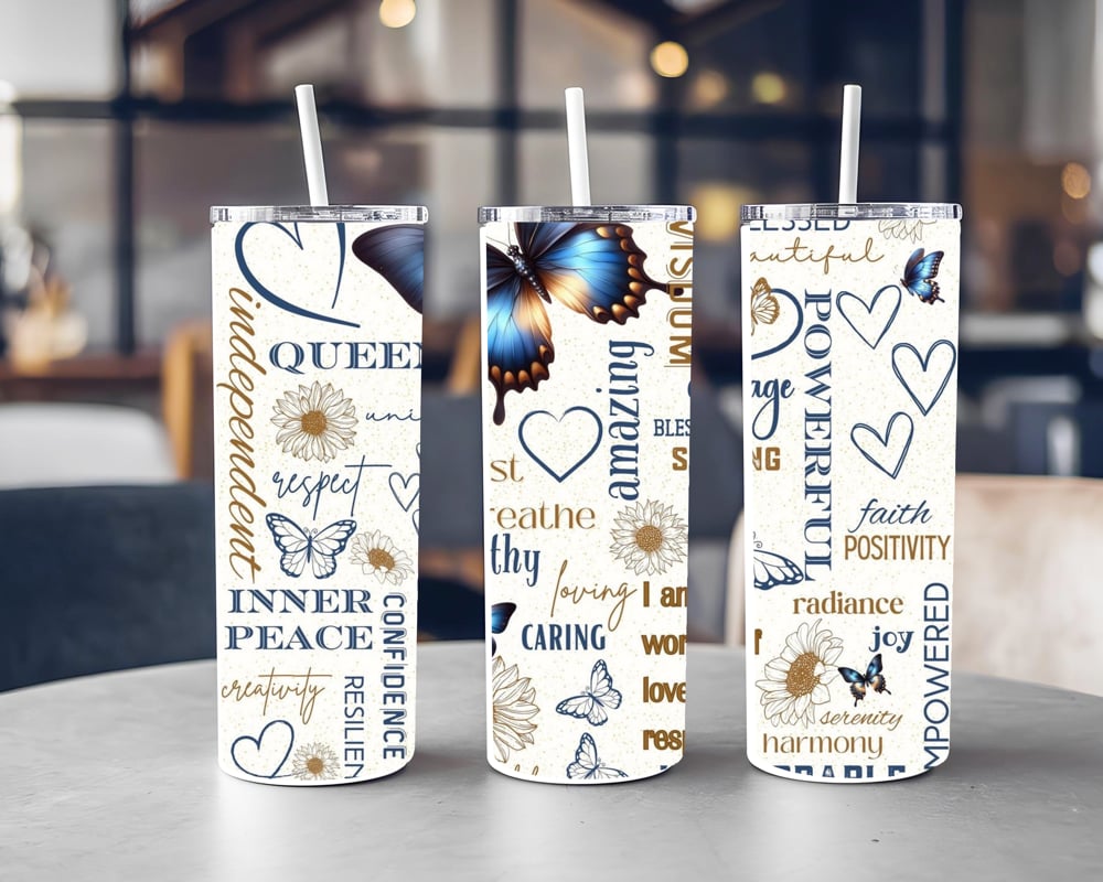 A sparkling 20oz glitter tumbler covered in uplifting words for women, featuring phrases like I am blessed, queen, independent, intelligent, wisdom, and courage. Finished with a soft blue and gold butterfly and tiny hearts for a gentle, empowering touch.